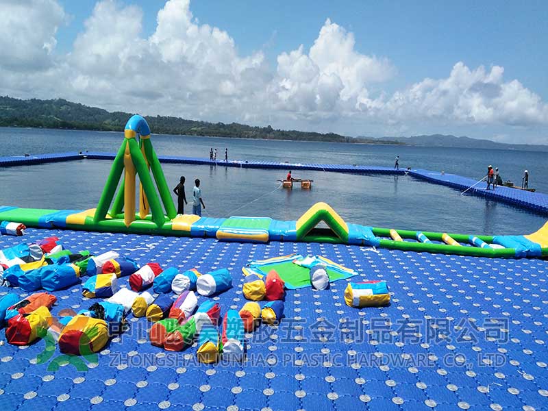 水上游泳池、天然浴场是指用浮动平台在水面上圈定固定的面积的水域,或者直接将浮动平台漂浮在水面上形成的以天然水域为水源的季节性游泳池。因为可以根据需要自由选择浮动平台颜色、形状,甚至可以在平台上用不同颜色浮筒组合成不同图案,这样的亲水环境是室内游泳池或游泳馆不能够满足的。